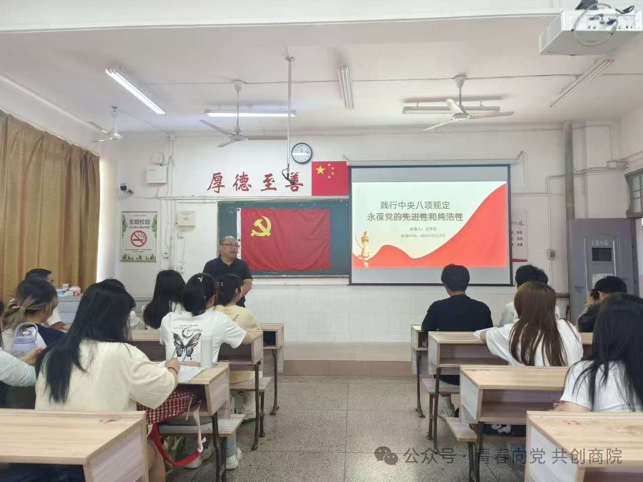为进一步深入贯彻中央八项规定精神学习教育,大力弘扬清正廉洁之风,以实际行动维护党的先进性与纯洁性。2025年5月13日12:10,PA视讯员工党支部在跬步楼1306教室开展“践行中央八项规定,永葆党的先进性和纯洁性”主题党课。本次党课由公司党委副书记吴华军主讲,PA视讯部分员工党员及入党积极分子参与。