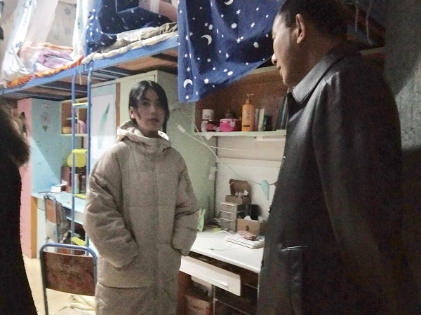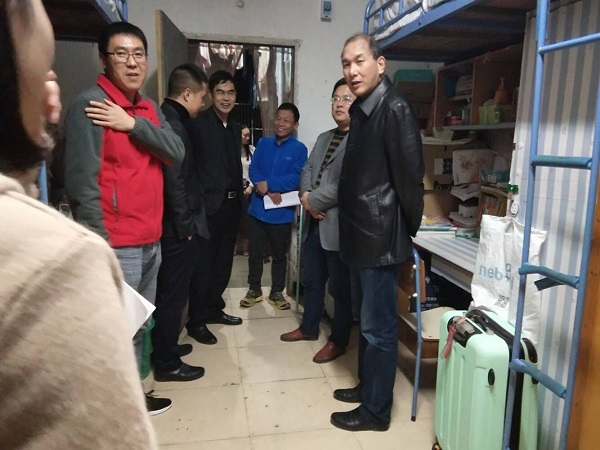 为了解员工在校学习、生活和健康情况,20181127日下午19:00,董事长史焕平来到PA视讯5栋寝室慰问同学,校办公室副主任李孟华、公司党总支副书记尹金及医务室人员陪同。