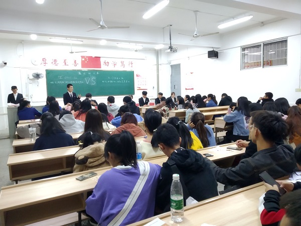 继正方19市场营销国际一班、反方19市场营销国际二班简单的自我介绍后比赛如期举行,场上气氛也变得紧张而激烈。19市场营销国际一班作为正方首先陈述立论,一辩辩手是市场营销国际一班的郑蝶,她的一番慷慨陈词,引得在座观众雷鸣般的掌声。反方一辩市场营销国际二班的李琳也不甘示弱,她以巾帼不让须眉的气势表现自如,灵巧地建立了己方论点“给走头有路的人捐款是愚蠢的”,让正方辩手倍感压力。盘问环节,双方一辩的问题回答也都很巧妙,不分上下。比赛最精彩的自由辩论环节把场上氛围拉向最高点,反方自由辩手黄雅楠清晰的思路和巧妙的陈词给观众留下了深刻印象。双方辩手都巧舌如簧、能言善辩,台下观众既而屏息凝神,既而忍俊不禁,无不感叹比赛的精彩。