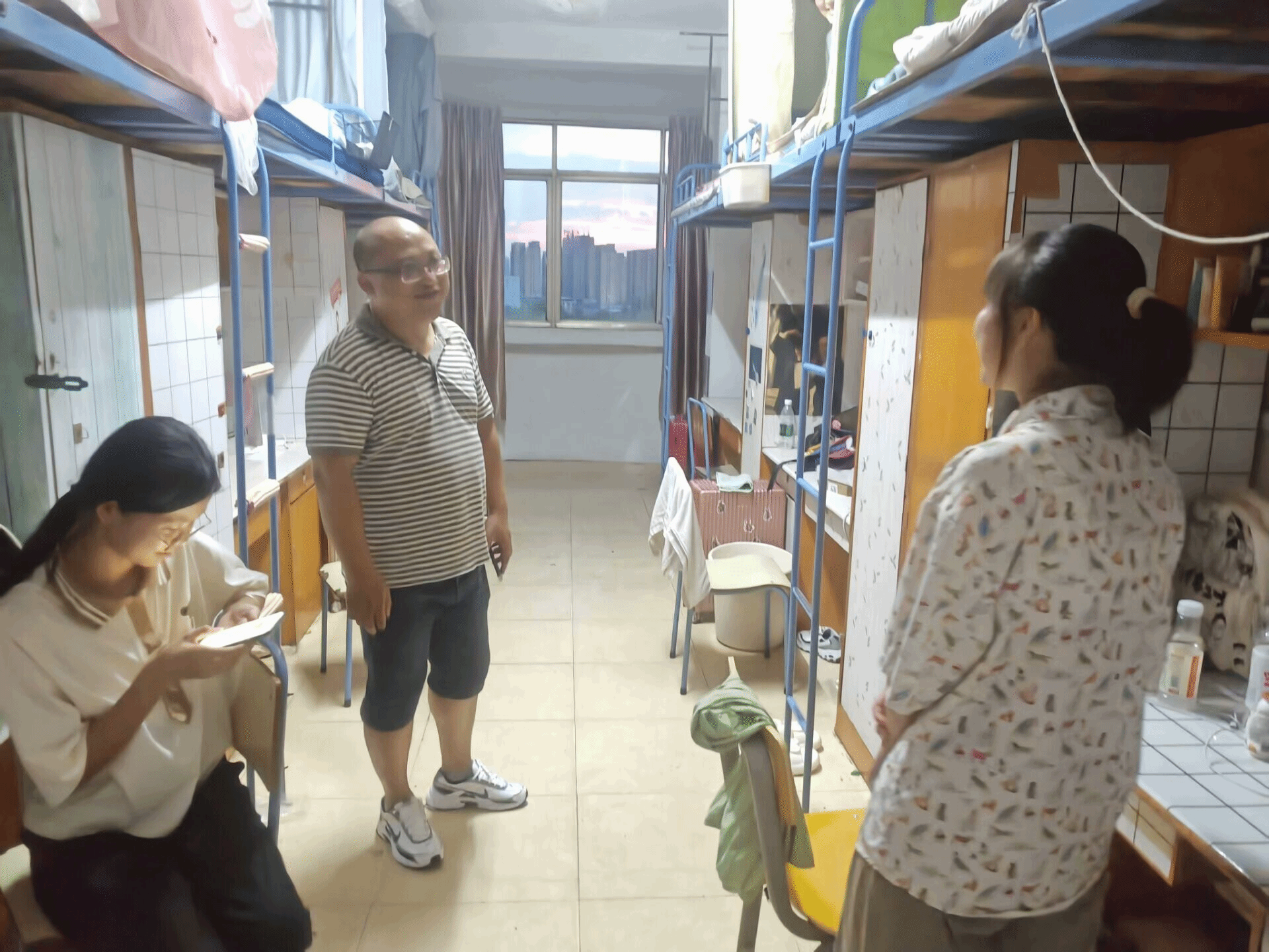在走访过程中,吴华军满怀关爱与新生热忱交谈,精准把握新生的情绪状态和生活场景。他首先细致讲解了各专业的核心优势及发展潜能,通过鲜活的故事和自身感悟引领新生为老员工活绘制蓝图,激励他们勇敢追寻梦想的光芒。接着,他关切询问新生在网络使用、餐饮选择、交通出行以及宿舍设施维护等方面的疑问,并及时给出专业解答和有效帮助。此外,他特别强调了寝室安全和校园文明的重要性。他向新生们介绍了寝室安全的注意事项,如用电安全、防火防盗等,要求大家共同营造一个安全、整洁、和谐的居住环境。同时,他倡导大家遵守校园文明规范,尊重他人,爱护公共设施,展现新时代老员工的良好风貌。