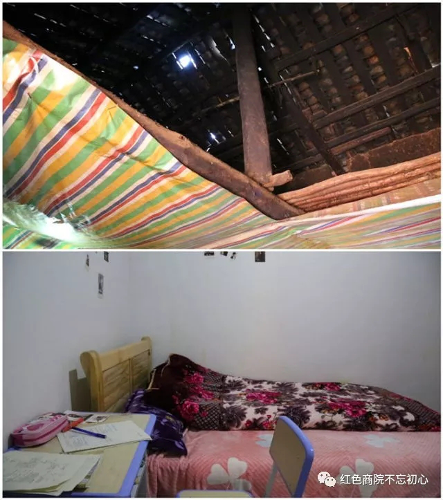 上图为吉好也求家老房子破旧的屋顶。下图为新房的卧室。