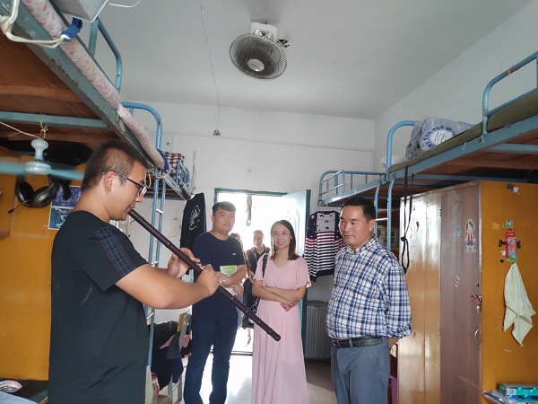 韩书记等一行人来到员工宿舍,首先核对了各寝室床位信息及员工入住情况。在宿舍里,韩书记了解了各位同学的学号及班级辅导员的信息并亲切询问他们到校后的住宿、就餐等方方面面的情况并提醒同学们有困难向辅导员反映。