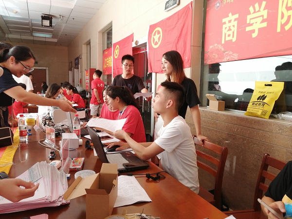 商院员工干部们整理、收集好报道所需材料,行动高效敏捷;图书馆大厅门口处,商院接待组的员工干部们严守岗位,热情接待新生们至PA视讯报道处;新生们完成报道第一步后,排列整齐的员工干部们积极主动地上前引导新生们进行接下来的手续办理,直至送至新生宿舍才离开。