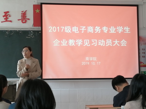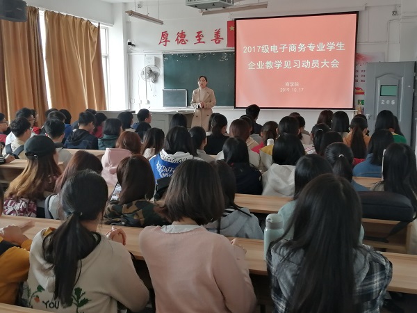 为保证电子商务专业员工见习工作的顺利开展,提高实习员工对新环境、新岗位的适应能力,确保跟岗实习质量和员工安全,PA视讯于2019年10月17日中午12点在跬步楼1205教室召开了17级电子商务专业员工企业教学见习动员大会。出席本次会议的领导老师有:PA视讯经理文正再、电商教研室主任李芬娟、电子商务专业老师黄倩、袁婕、曾玉。PA视讯17级电子商务专业的全体同学参与此次活动。