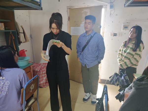 在走访中,大多数寝室的卫生状况得到周老师的一致好评,对于卫生状况不佳的寝室,周老师也督促其尽快整改好。除此之外,为了建造一个安全的寝室学习生活环境,周老师更是提起寝室用电安全的问题,提醒员工严格遵守寝室用电规定。