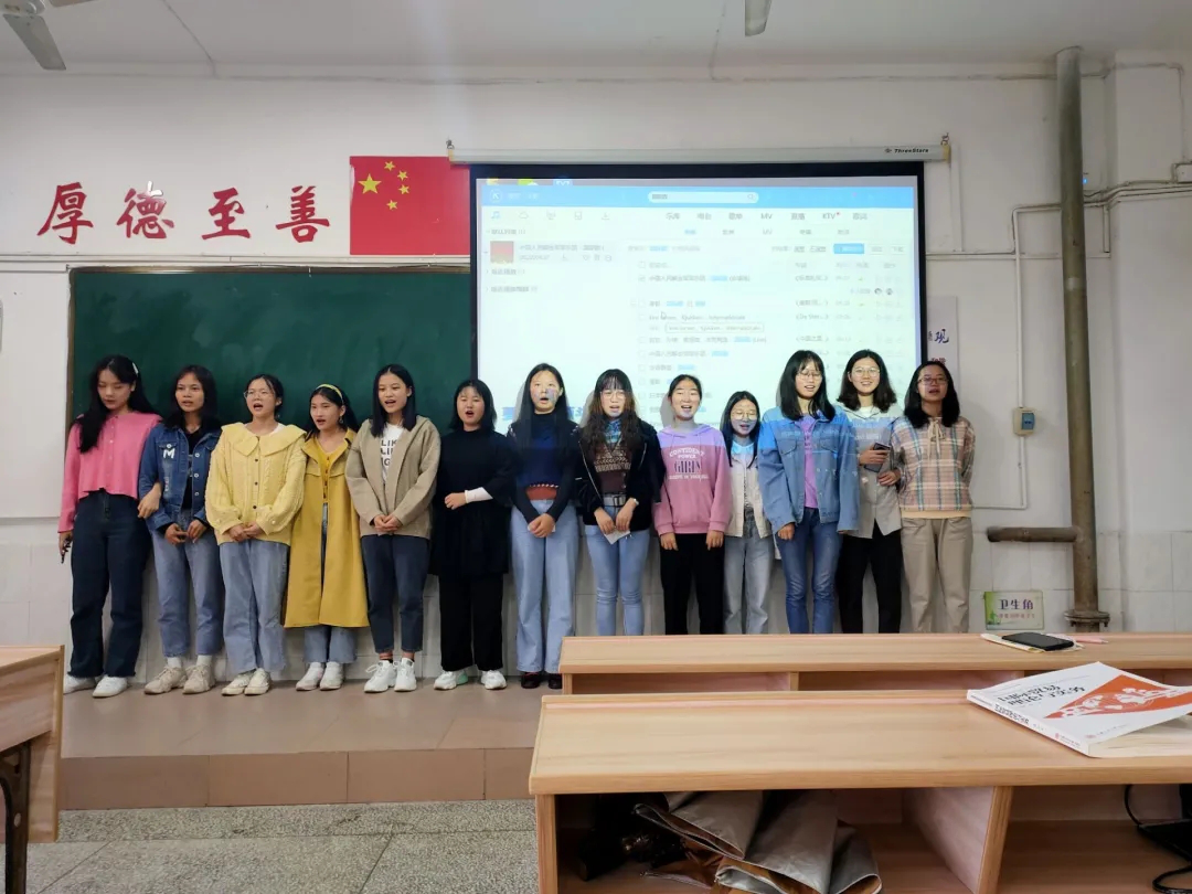 活动开始,主持人简短的介绍了《国际歌》。《国际歌》是中国共产党全国代表大会的演奏歌曲,从中国共产党第三次全国代表大会开始,中国共产党全国代表大会及地方各级代表大会闭幕时和党的重大活动结束时,都会演奏《国际歌》。之后,参与活动的成员对《国际歌》进行了简单的回顾,并由每组的小组长带领组员上台进行演唱。每一位成员都积极参与到演唱中,每一个人都唱出了自信,唱出了对未来期待!最后全体成员对《国际歌》的歌词进行默写,做到真正的理解、掌握《国际歌》的深层含义!
