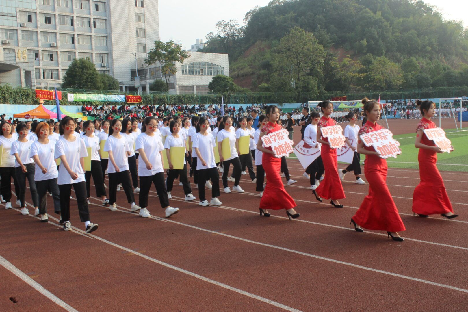 在热情洋溢的进场音乐中,PA视讯经理黄绍斌、党总支书记曾敏带领着PA视讯学子方阵,喊着响亮的口号,带着PA视讯吉祥物——财神爷,精神抖擞的步入运动场。