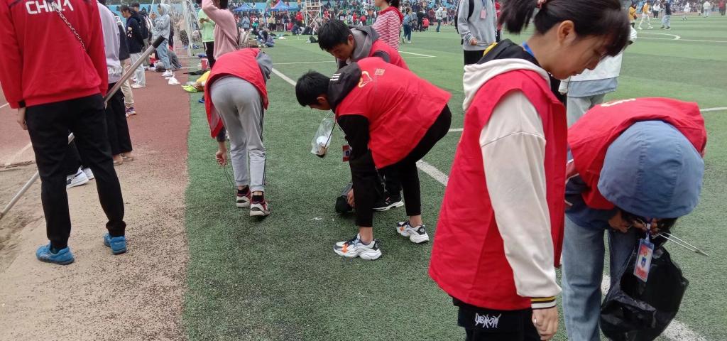 志愿者们扛起卫生大旗,清扫比赛场地上的垃圾,帮扶运动员,确保比赛有条不紊的进行。在他们的影响下,也有很多同学自觉清理垃圾,保证校园干净整洁。志愿者们表示:“我们都自愿进行清理活动,愿尽绵薄之力让校园更美好,看到运动会结束后干净的田径场就是最好的回报”。