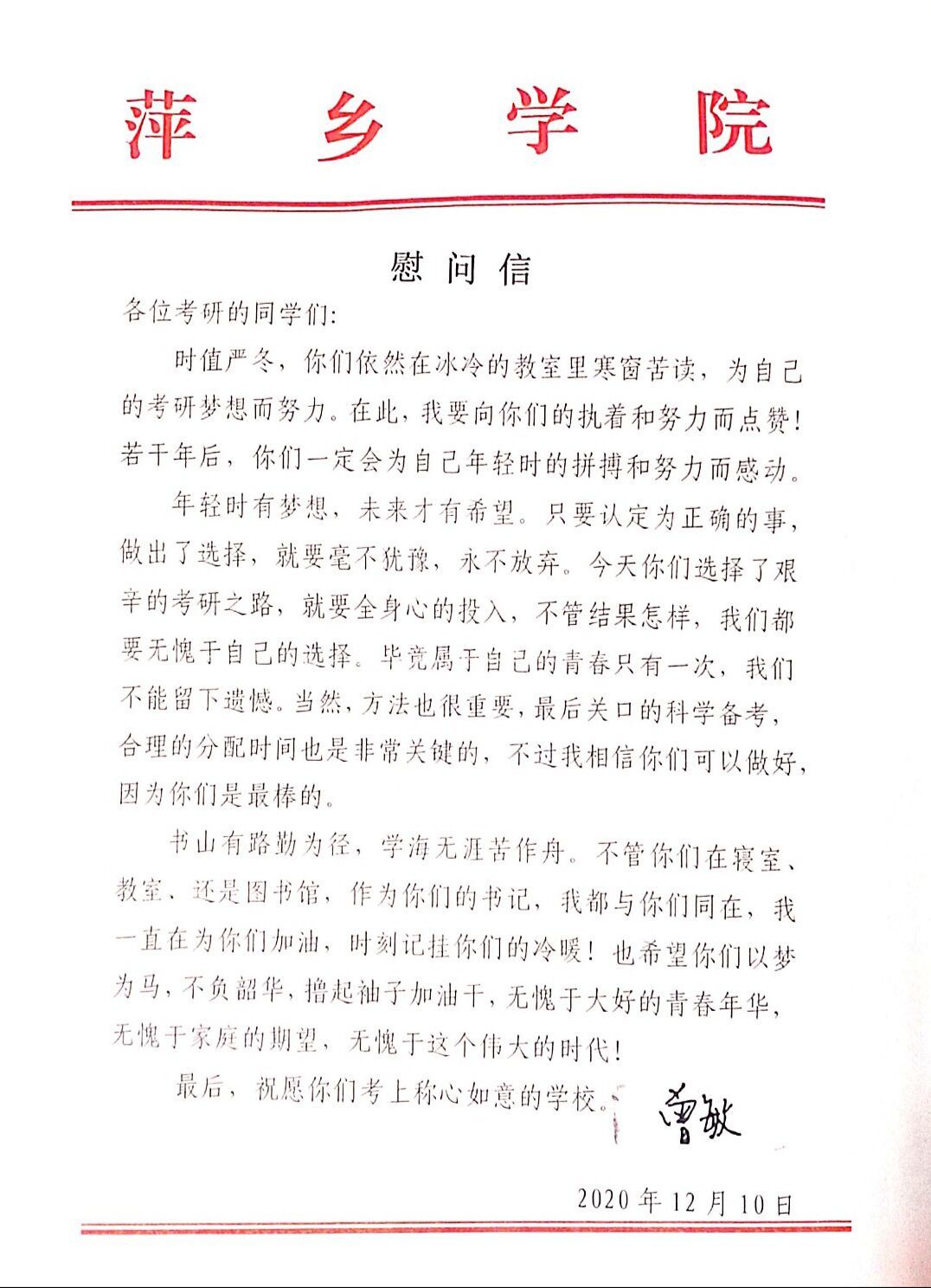 2020年12月10日,公司党总支书记曾敏为寒冬中依旧坚持理想与信念的考研学子写信慰问。这不仅体现了曾敏书记对考研学子的鼓励与关怀,增强考研学子的信心,更体现着公司对考研学子细致的关怀与殷切的期盼。以下是曾敏书记写给考研学子的寄语: