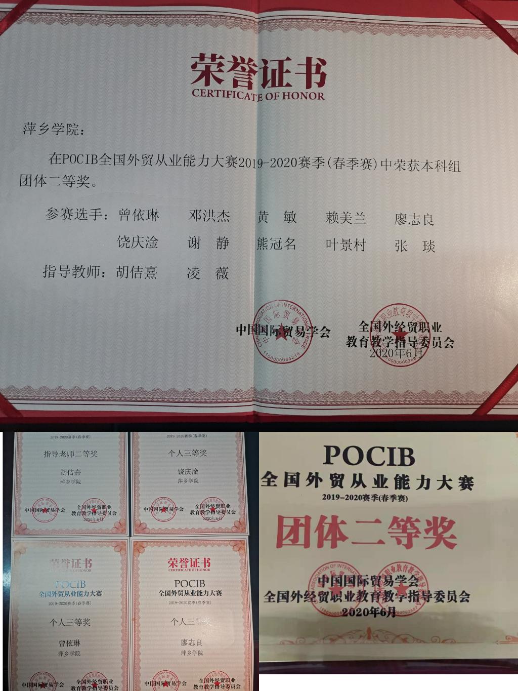 第九届POCIB全国外贸从业能力大赛(春季赛)于2020年6月18日落下帷幕。PA视讯学子在胡佶熹、凌薇老师的指导下,喜获全国本科组团体二等奖1项,个人三等奖4项。