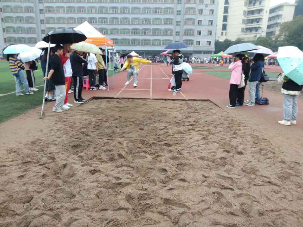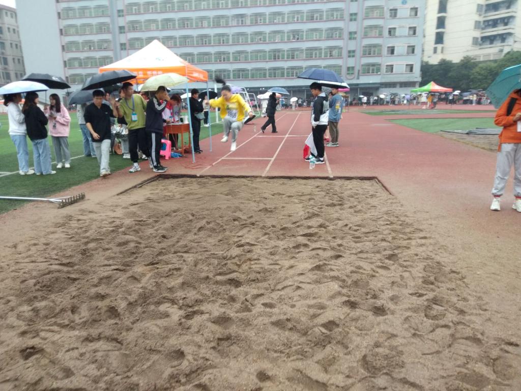 比赛开始,运动员们在沙坑旁提前做好热身运动,裁判员一声令下,运动员们站在跳远线处突然发力,在一阵有力的助跑后,腾空跃起并奋力向前跳出,伴随着无数同学的注视,一道道优美的弧线落在了沙坑上。刘雪同学更是一举拿下乙组女子三级跳第4名的好成绩。