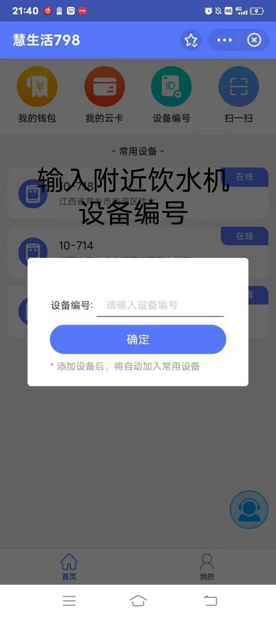 4、输入附近饮水机设备编号或者扫一扫饮水机的二维码