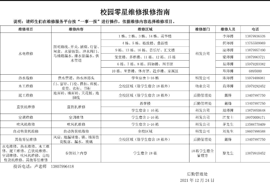 风扇维修6895000、下水道堵塞疏通13697990828、木工维修、窗帘维修15979292452、水电维修6895000、热水维修13307999537、15979486061、纱窗、玻璃及其它维修6682078;以上是维修的电话,由于新学期开始,很多地方需要维修,所以维修速度会比较慢,请同学们耐心等待;也可以通过I萍院进行线上维修报修。