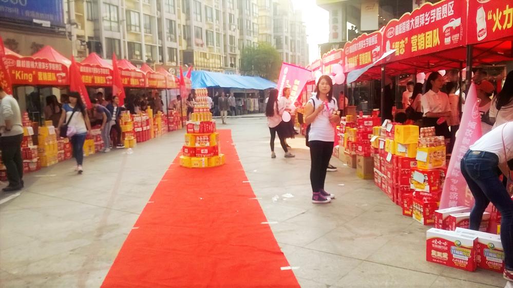 上午8:30,步行街中段摆设了两列帐篷,各队旗帜飘扬,同学们均整装待发。在陈列好各色商品后,摆放造型层出不穷,摊点各具一格。人来人往,络绎不绝,而比赛更是热火朝天地进行着。或是搬运货物另设摊点,或是着力推销提高业绩。下午5:30,赛区的舞台响起了音乐,同学们纷纷上台献上歌曲,并为自己的赛队博取人气。主持人与观众们游戏互动,气氛活跃,不亦乐乎。一天的忙碌过后,各队销量均可,最高的卖出了六十余箱。