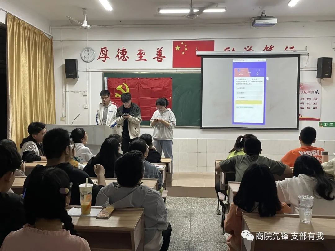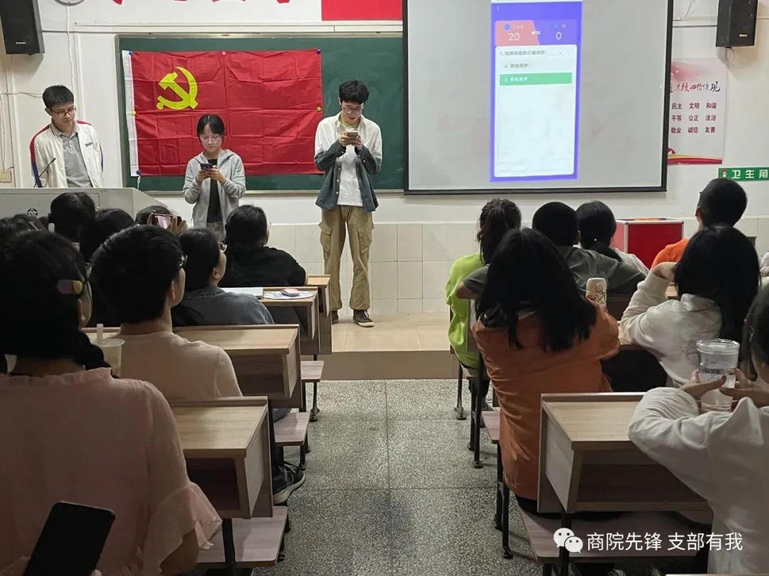 比赛正式开始前,参赛人员通过抽签方式决定自己的比赛顺序,其中抽到轮空的选手直接晋级下一轮,其余选手按抽签到的数字进行双人对战,胜者晋级。此次比赛使用指定手机进行比赛,内容均来自学习强国APP上的双人对战模式。在主持人讲解完规则后,比赛正式拉开序幕。比赛过程中,参赛选手答题迅速,眼疾手快,思考周全。每轮比赛结束时,现场都响起了热烈的掌声,比赛现场气氛十分热烈。选手们实力不相上下,经过精彩的角逐,比赛如约进行到了决赛阶段,通过比拼后产生了本次的周答题王、周秒答王。获得周答题王的是21市营1班的黄志豪,周秒答王为21知产班的邹林航。此次晋级月赛的参赛选手由前六名以及用时最短的两名共八名选手组成,他们分别是19电商1班柯文翠、20市营1班兰梓怡、20市营2班张季萍、20市国班施芬、21电商1班李妍晴、21市营1班黄志豪、21旅管班郭祎敏、21知产班邹林航。