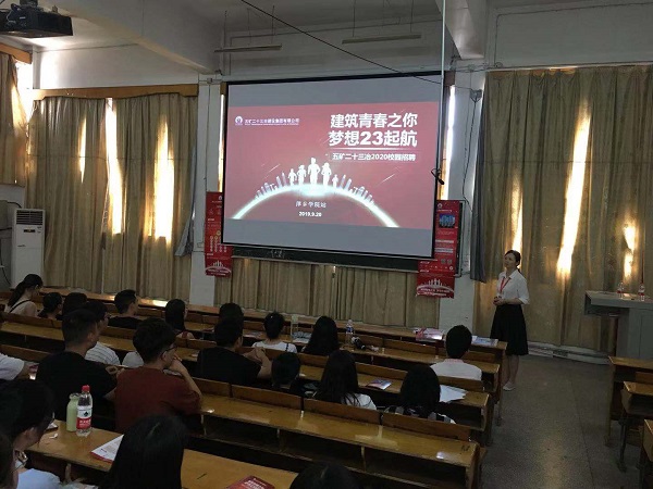中国五矿二十三冶建设集团有限公司招聘宣讲会于9月20日中午12:50至17;00在跬步楼1101多媒体教室进行,参加本次会议的是2020届的本专科毕业生。